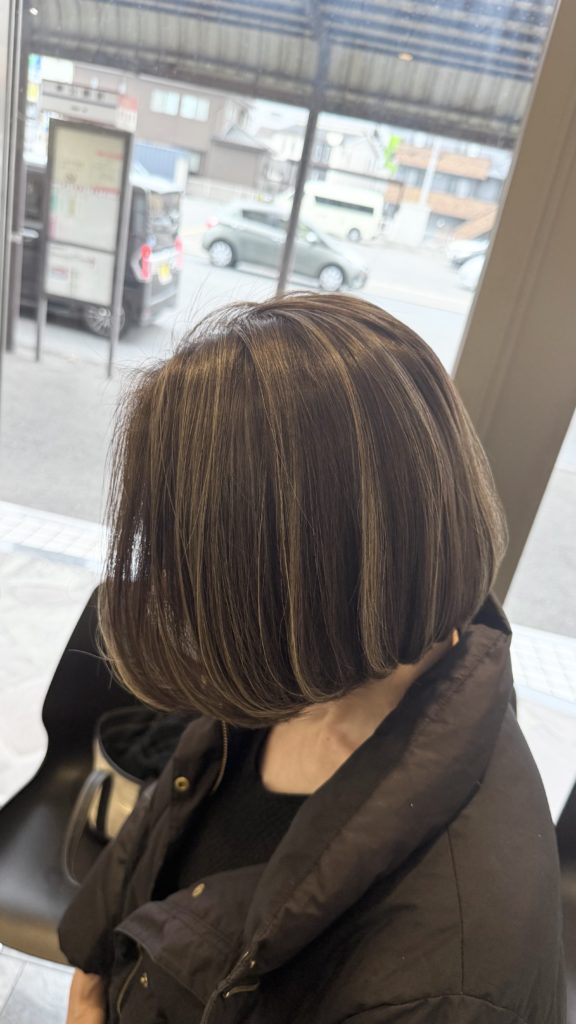 ハイライトを入れることで光の反射が生まれ、ペタッとしやすい髪にも自然な立体感とツヤ感が出ます。